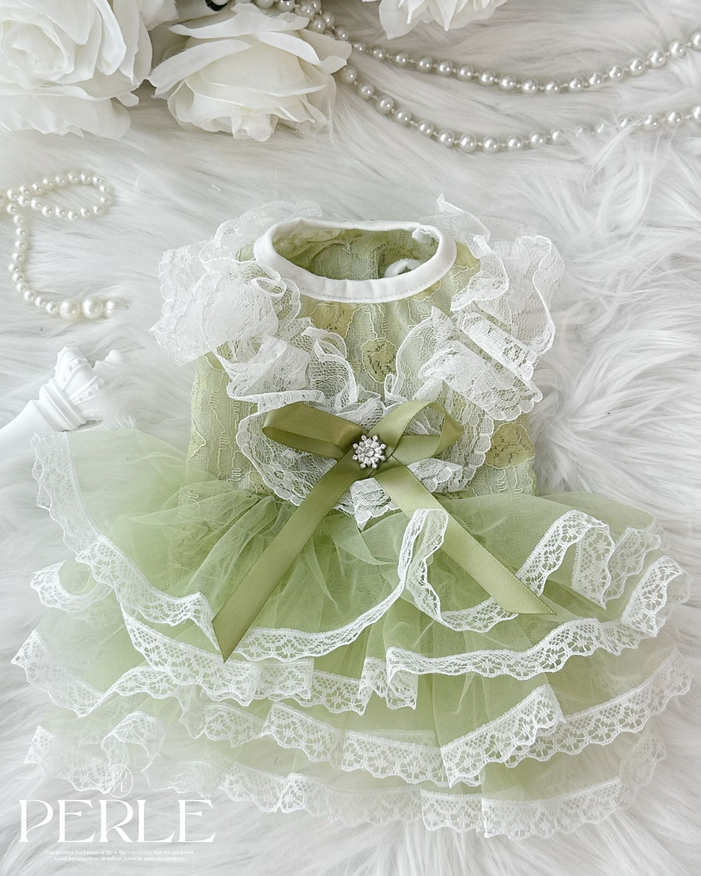 Green frill ribbon pet dress